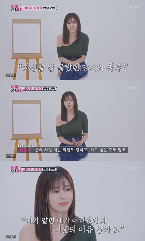 서동주는 "저는 인생 2막 10년 차다. 27살에 결혼을 했고 지금 만으로 41살이다"라고 얘기하며 당시 이른 나이에 결혼을 결심했던 계기로 "그 때 많은 친구들이 결혼을 하기는 했다. 그래서 뭔가 남들은 다 갔는데 나만 도태될 것 같다는 불안감에 빨리 하려고 했던 것 같다. 지금 생각하면 후회된다"고 털어놓았다.