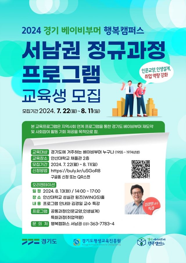 경기도평생교육진흥원이 '경기 베이비부머 행복캠퍼스 서남권(안산) 교육과정' 참여자를 8월 11일까지 모집한다. 교육과정은 김경일 아주대학교 교수의 특강과 함께 인생설계, 취업 역량 강화, 인문교양 등 13개의 다양한 프로그램으로 구성됐다.