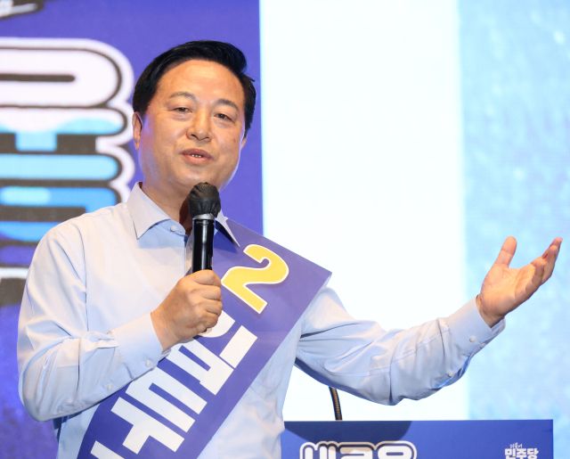 ▲지난달 28일 오전 충북 청주 cjb 미디어센터에서 열린 더불어민주당 당 대표·최고위원 후보자 합동연설회에서 김두관 당 대표 후보가 정견을 발표하고 있다. ⓒ연합뉴스
