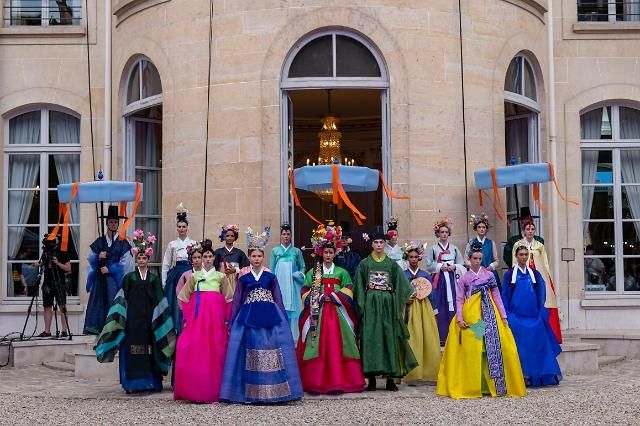 当地时间1日,韩国文化体育观光部在巴黎奥运会的“韩国之家”(Korea House)庭院内举行“韩国日”活动,上演华丽韩服秀,向海外宣传韩国传统文化。