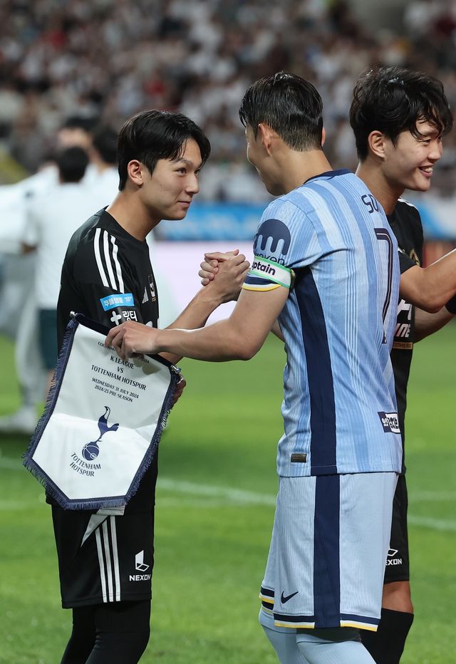 지난달 31일 서울월드컵경기장에서 열린 2024 쿠팡플레이 시리즈 토트넘과 팀 K리그의 경기에 앞서 토트넘 손흥민과 팀 K리그 양민혁이 인사하고 있다. / 연합뉴스