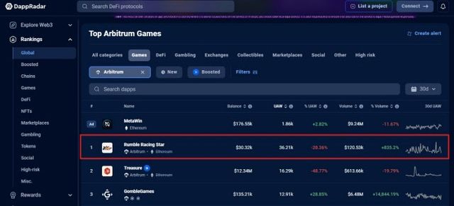 디랩스 게임즈의 '럼블 레이싱 스타'가 댑레이더 기준 이더리움 레이어2 기반의 아비트럼 게임 카테고리 1위를 달성했다.
