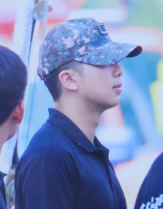 특히 '15사단 군악대'라고 적혀 있는 검은색 티와 군복 바지를 입고 여느 군인들과 다르지 않은 일상을 보내고 있는 RM의 모습이 눈길을 끌었다. 이어 RM이 쓴 상급 계급장이 달린 모자를 통해 상병 진급 소식까지 전해졋다.