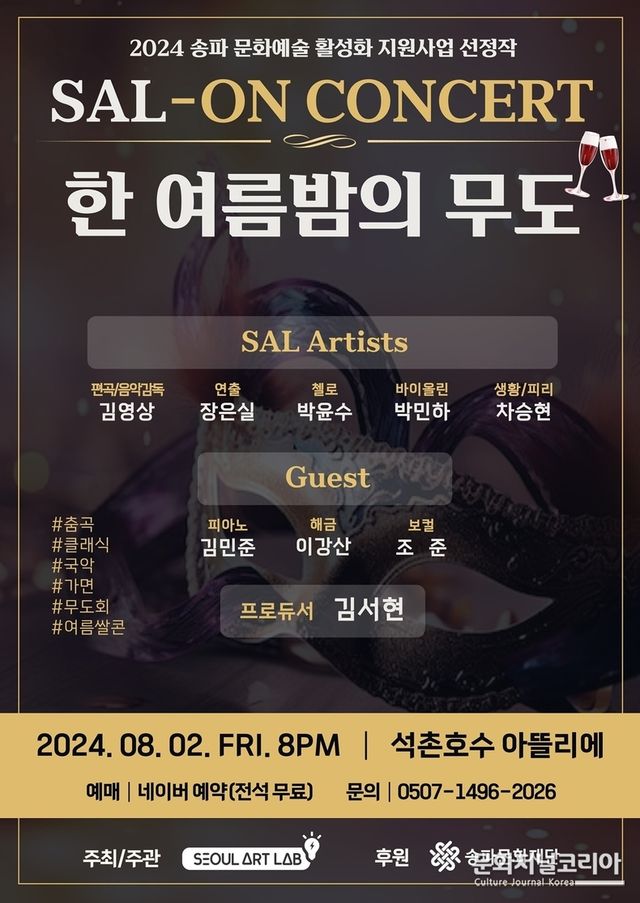 문화저널코리아 김영일 기자 | 서울아트랩(대표 김서현)이 내일(2일) 밤 8시, 서울 송파구에 위치한 석촌호수 아뜰리에에서 SAL-ON CONCERT(쌀롱콘서트, 이하 쌀콘) <한 여름밤의 무도>를 개최한다. 프로듀서 김서현, 편곡/음악감독 김영상, 연출 장은실이 제작하고, 박윤수(첼로), 박민하(바이올린), 차승현(생황/피리), 김민준(피아노), 이강산(해금), 조준(보컬)이 출연한다.
