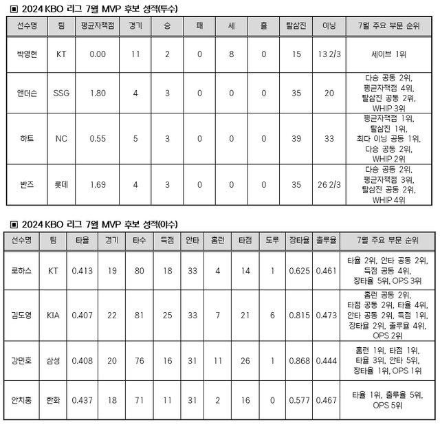 한국야구위원회(KBO)는 2일 2024 신한 SOL Bank KBO리그 7월 월간 MVP 후보를 공개했다. 투수 중에서는 KT 위즈 박영현, SSG 랜더스 드류 앤더슨, NC 다이노스 카일 하트, 롯데 자이언츠 찰리 반즈, 야수 중에서는 KT 위즈 멜 로하스 주니어, KIA 타이거즈 김도영, 삼성 라이온즈 강민호, 한화 이글스 안치홍이 후보로 선정돼 7월 MVP 수상을 노린다.