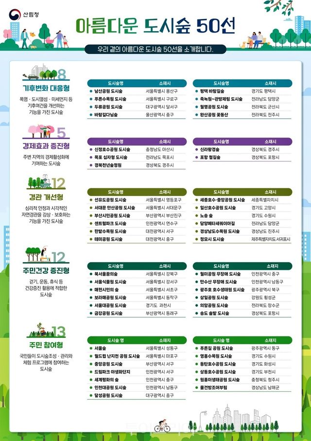 선정된 50개 도시숲은 역할과 기능에 따라 △기후변화 대응형 △경제효과 증진형 △경관 개선형 △주민건강 증진형 △주민 참여형 등 5가지 유형으로 구분된다.