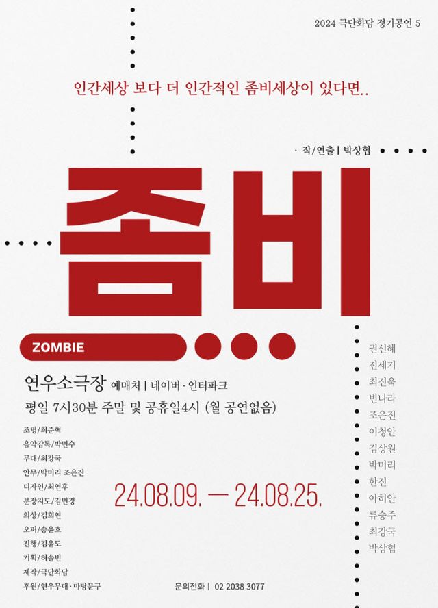 좀비 바이러스가 세상에 퍼지면서 등장한 좀비들을 피해 사람들이 대학로 한 극장에 모여든다. 이들 사이에 외모는 징그럽지만 인간보다 더 인간적인 좀비가 나타난다. 좀비는 “좀비가 돼 세상으로 함께 나가자”는 충격적인 제안을 한다. 사람들은 경악하면서도 고민에 빠진다. 좀비를 통해 인간의 본성과 사회 본질에 질문을 던지는 박상협 극작·연출 작품이다. 배우 권신혜, 전세기, 최진욱, 변나라, 조은진, 이청안, 김상원, 박미리, 한진, 아히안, 류승주, 최강국, 박상협이 출연한다.