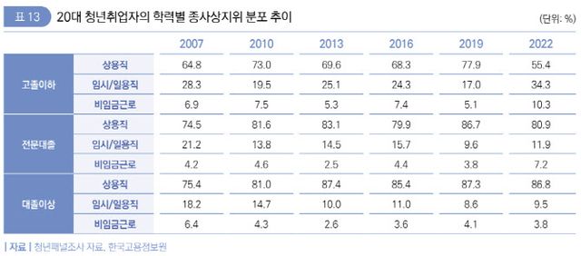 한국고용정보원이 최근 발표한 ‘20대 청년세대의 취업 특성과 변화’ 보고서를 보면 20대 취업자 중 상용직 비율은 2019년 84.7%에서 2022년 73.2%로 떨어졌다. 반면 임시·일용직 취업자는 같은 기간 11.0%에서 19.8%로 크게 올랐다. 이번 분석은 2007년과 2021년 청년패널조사를 기반으로 이뤄졌다.