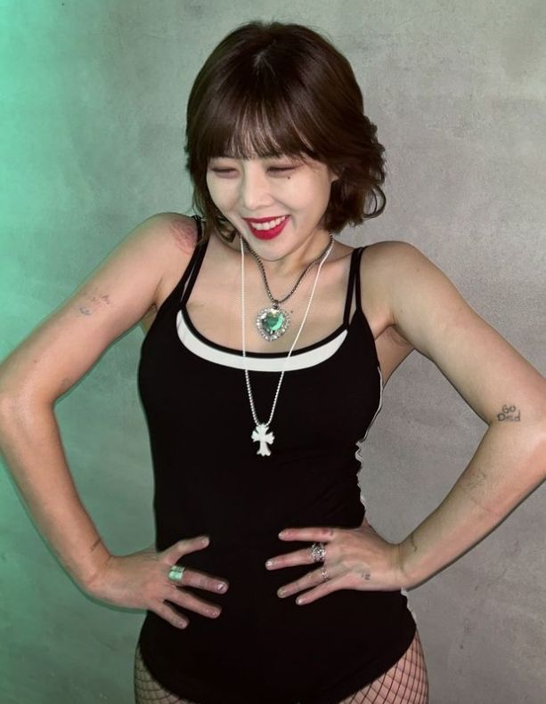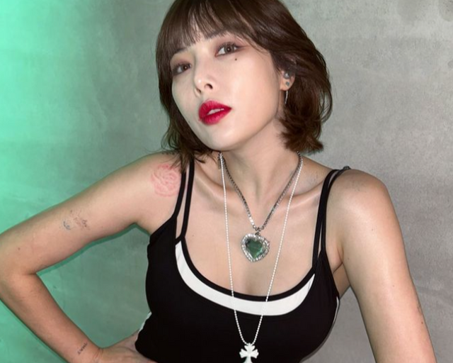 사진 속 현아는 수영복처럼 몸에 딱 붙는 무대 의상을 입고 있으며 두 개의 화려한 펜던트 목걸이로 포인트를 줬다.