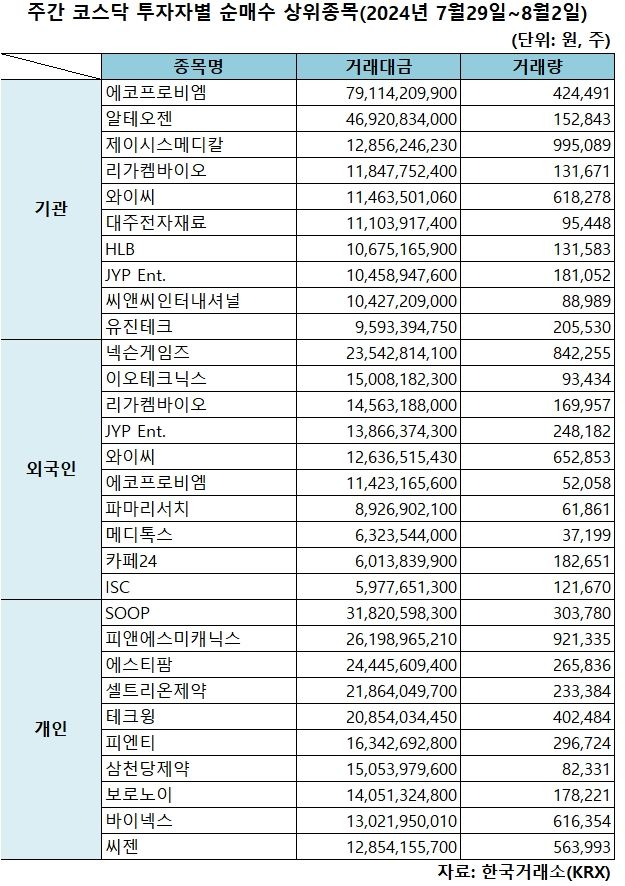 기관 '에코프로비엠'·외인 '넥슨게임즈'·개인 'SOOP' 1위 [주간 코스닥 순매수- 7월29일~8월2일]