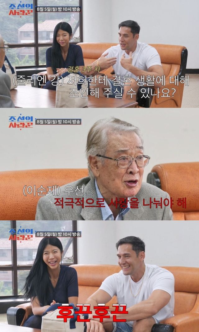 신혼 생활을 즐기고 있는 줄리엔강은 “결혼생활 오래 하셨으니까 저희한테 조언 주실 수 있을까요?”라며 결혼 58년 차 이순재에게 부탁했다. 이에 이순재는 “우선 적극적으로 사랑을 나눠야 해”라며 결혼 3주 차 부부 줄리엔강과 박지은을 빵 터지게 했다.