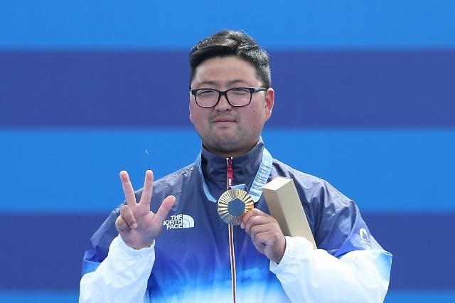8月4日,在巴黎荣军院广场,巴黎奥运会射箭男子个人赛结束争夺,韩国名将金优镇摘金。【图片提供 韩联社】
