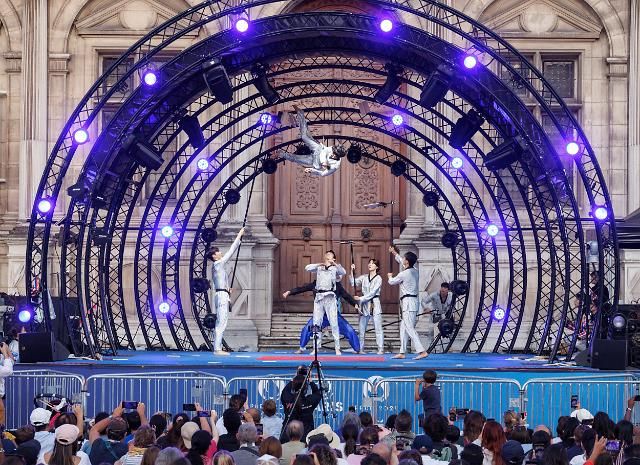 当地时间4日,在法国巴黎市政府门前,世界跆拳道联盟示范团向巴黎市民展示跆拳道高难度动作。