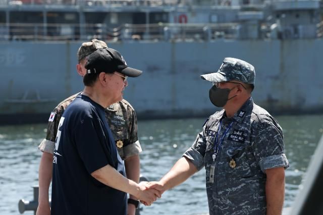 2023年8月,尹锡悦(左)在休假期间视察镇海海军基地慰问官兵。【图片提供 韩联社】