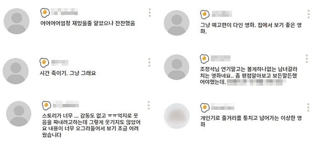 이 밖에도 "엄청 재밌을 줄 알았으나 잔잔했음" "시간 죽이기, 그냥 그래요" "기대만큼 아쉬움도 큰 듯" "개인적으로 조정석을 좋아하지만 이 영화가 무엇을 말하고자 하는 건지 알 수가 없네요. 그냥 조정석이 조정석 한 것만 인정" "조정석 연기 말고는 볼 게 하나도 없는 남녀 갈라치는 영화" "개인기로 줄거리를 퉁치고 넘어가는 이상한 영화" 등의 혹평도 있었다.