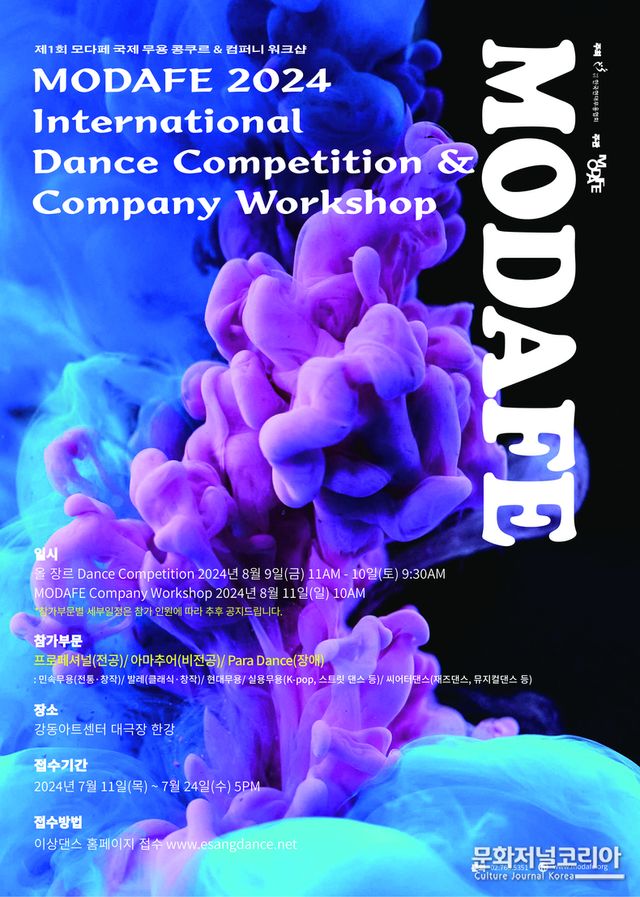 문화저널코리아 오형석 기자| (사)한국현대무용협회(이사장/ 모다페 국제 무용 콩쿠르 조직위원장 : 김형남, 세종 대학교 교수)는 오는 8월 9일(금)부터 11일(일) 총 3일간 강동아트센터 대극장 한강에서 ‘제1회 모다페 국제 무용 콩쿠르 & 컴퍼니 워크샵’을 개최한다.
