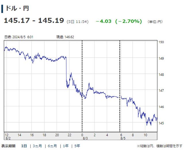 리소나 홀딩스의 이구치 케이이치 시니어 전략가는 “미 경제의 소프트 랜딩(연착륙) 시나리오 일변도였던 시장이 미 경제·고용 지표의 악화로 급속히 비관론에 기울고 있다”며 “심리적 저항선이었던 145엔대까지 엔이 상승한 것으로 손실을 각오한 엔 매입·달러 매도가 나오고 있다. 현재는 140엔까지 엔화가 상승할 가능성도 있는 상황”라고 말했다.
