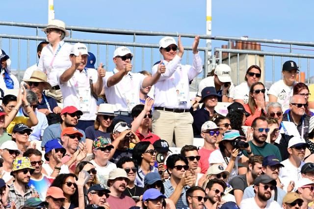 当地时间3日上午,现代汽车集团会长郑义宣在巴黎举行的女子射箭个人赛16强赛中为韩国选手加油助威。【图片来源 韩联社】