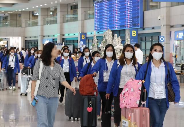 6日,首批参加韩国外籍家政管理人员示范项目的菲律宾籍劳动者从仁川国际机场入境。