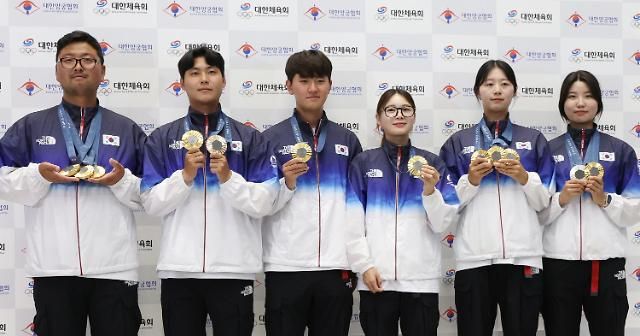 6日,巴黎奥运会韩国射箭代表团成员抵达仁川国际机场。韩国射箭代表团在本届巴黎奥运会上包揽该项目五枚金牌,创下历史最佳战绩。