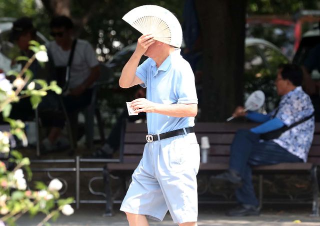 부산에 10일째 폭염경보가 이어진 5일 오후 부산 연제구 녹음공원에서 한 시민이 부채로 햇빛을 가리며 이동하고 있다. / 뉴스1
