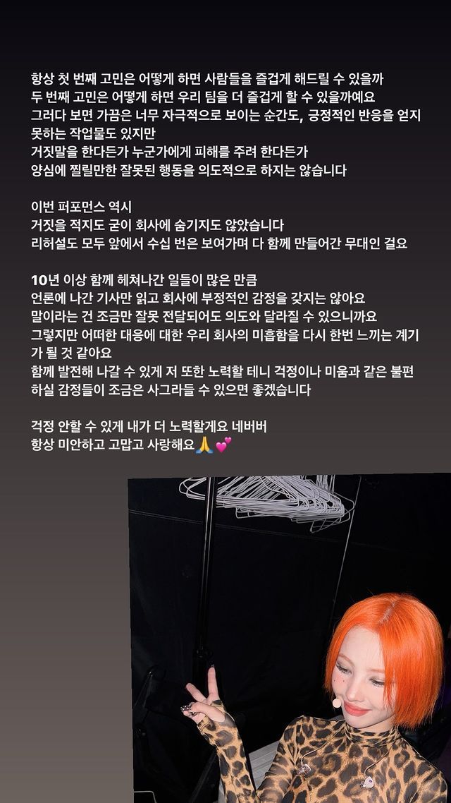 이어 "이번 퍼포먼스 역시 거짓을 적지도, 굳이 회사에 숨기지도 않았다. 리허설도 모두 앞에서 수십 번은 보여가며 다 함께 만들어간 무대"라고 설명했다.