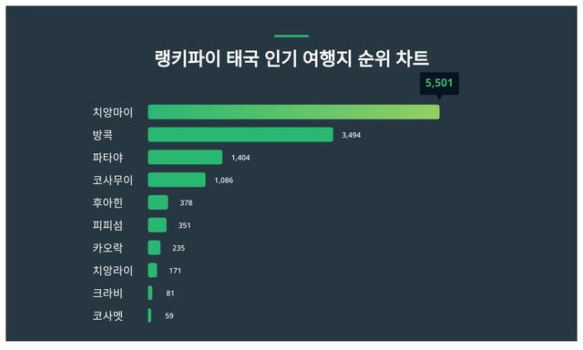 차트를 살펴보면 치앙마이가 5,501포인트로 해당 부문 1등을 기록했다. 바로 뒤 방콕이 3,494포인트로 2등을 차지했다.