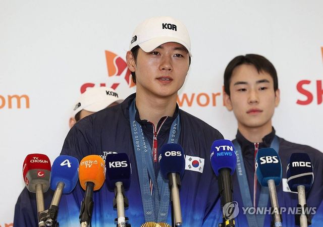 2024 파리 올림픽 펜싱 사브르에서 개인전과 단체전에서 금메달을 따낸 오상욱이 지난 5일 오후 인천국제공항 제1터미널을 통해 귀국한 뒤 취재진과 인터뷰하고 있다 / 연합뉴스