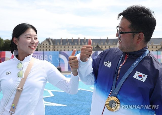 지난 4일(현지시간) 프랑스 파리 레쟁발리드에서 열린 2024 파리올림픽 양궁 남자 개인전에서 금메달을 딴 김우진(오른쪽)이 임시현의 축하를 받고 있다 / 연합뉴스
