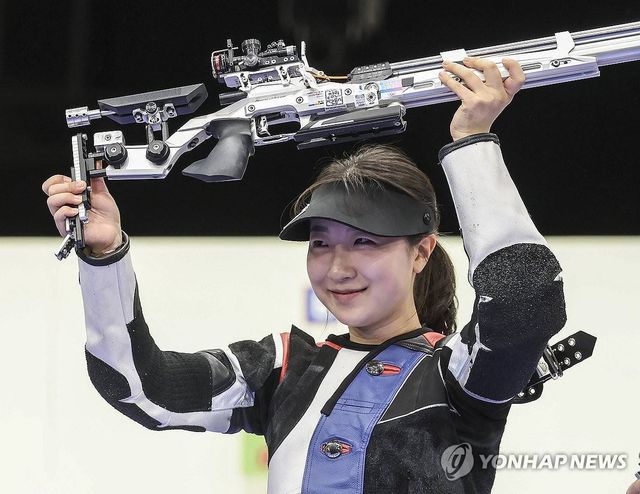 지난달 29일(현지시간) 프랑스 샤토루 슈팅 센터에서 열린 2024 파리올림픽 사격 공기소총 10m 여자 결선에서 금메달을 차지한 반효진이 기뻐하고 있다 / 연합뉴스