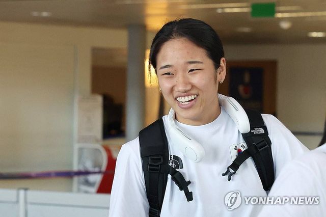 2024 파리올림픽 배드민턴 여자 단식에서 금메달을 차지한 안세영이 지난 6일(현지시간) 프랑스 샤를 드골 공항을 통해 출국하며 팬의 응원에 웃음으로 화답하고 있다 / 연합뉴스
