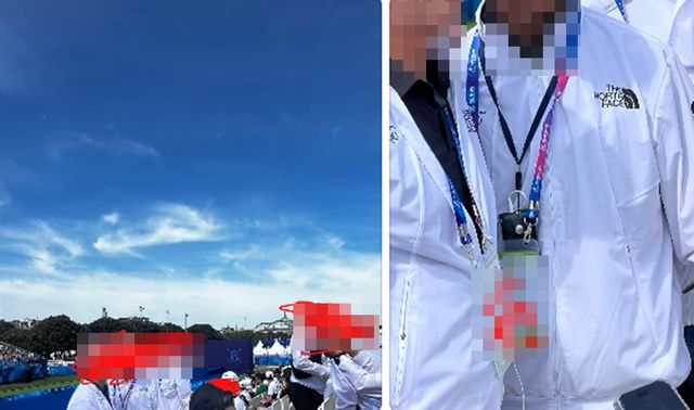 'OO체육회' 직함이 적힌 이름표를 목에 걸고 있는 사람들이 2024 파리올림픽 양궁 남자 개인전 경기에서 민폐 관람을 했다는 주장이 제기됐다. / 스레드