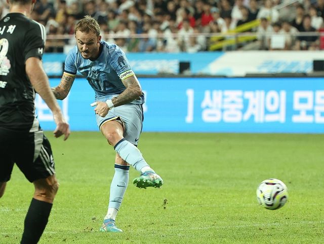 지난달 31일 서울월드컵경기장에서 열린 2024 쿠팡플레이 시리즈 토트넘과 팀 K리그의 경기에서 토트넘 제임스 매디슨이 슛을 시도하고 있다. / 연합뉴스