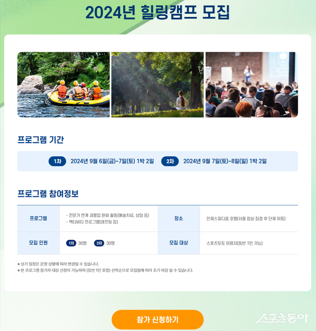스포츠토토코리아 관계자는 “스포츠토토 이용자들에게 큰 사랑을 받고 있는 ‘toto Refresh’ 운영에 이어 9월 행사를 진행하는 힐링캠프까지 현재 참가자를 모집 중”이라며 “스포츠토토를 이용하는 고객이라면 별도의 참가비 없이 무상으로 지원이 가능하기 때문에 많은 관심과 참여를 부탁한다”고 밝혔다.
