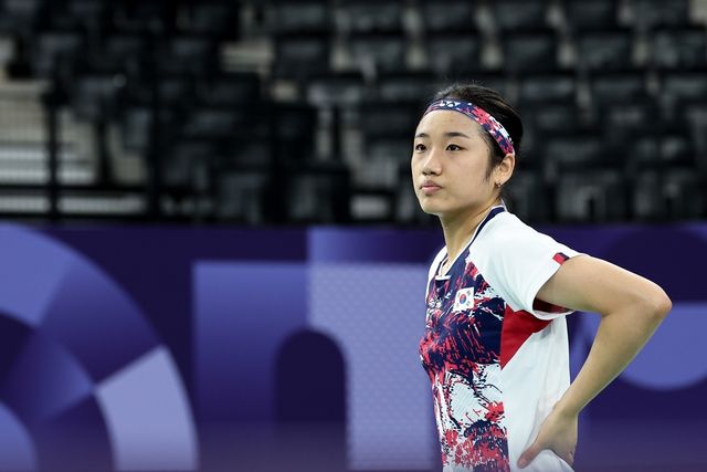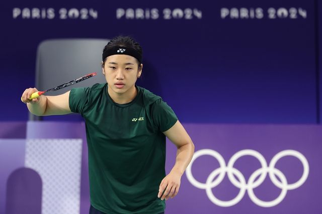 2024 파리올림픽에 출전하는 배드민턴 대표팀 안세영이 지난달 24일(현지 시각) 프랑스 파리 아레나 포르트 드 라 샤펠에 마련된 배드민턴 경기장에서 훈련하고 있다. / 연합뉴스