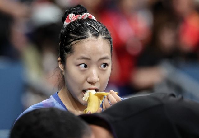 대한민국 탁구 대표팀 신유빈 선수가 지난 2일 오후 프랑스 파리 사우스 파리 아레나 4에서 열린 '2024 파리올림픽' 탁구 여자 단식 준결승 중국 첸멍 선수와의 경기에 앞서 바나나를 먹고 있다. / 뉴스1