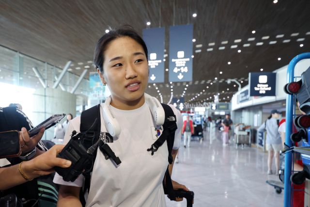 ▲2024 파리올림픽 배드민턴 여자 단식에서 금메달을 차지한 안세영이 6일(현지시간) 프랑스 샤를 드골 공항을 통해 출국하며 취재진의 질문에 답하고 있다. ⓒ연합뉴스