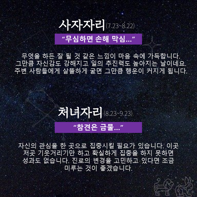 애정과 관련해서 특히 용기가 필요합니다. 싱글인 분이라면 마음에 드는 이성 앞에서 마음만 끓이고 있지 마세요. 당신의 마음을 정확하게 전달한다면 의외의 결과를 얻게 될 수도 있습니다.