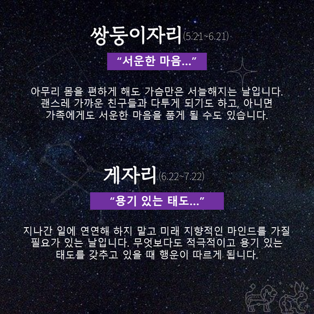 방바닥이 꺼져 라고 한숨을 쉬면서 궁상을 떨 수 있는 날입니다. 그리움과 외로움이 당신을 휘어잡을 수도 있고요. 이럴 때일수록 어깨를 활짝 펴고 바깥 공기를 많이 쐴 수 있도록 하세요.