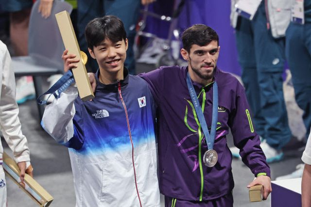 2024 파리올림픽 남자 58kg급 시상식에서 금메달을 따낸 박태준(20·경희대)이 은메달을 획득한 부상 선수 가심 마고메도프(아르제바이잔)를 부축해 시상식에 섰다.