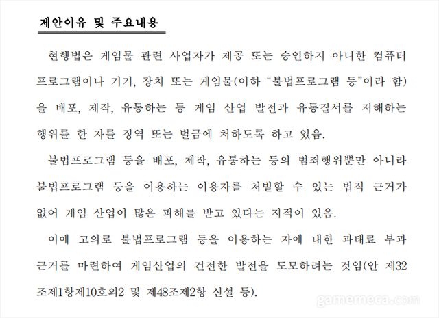 현재 게임법에서 핵 프로그램 제작과 배포는 불법행위다. 그러나 이용은 불법이 아니라 처벌 역시 없다. 이에 대해 김성원 의원은 제안이유를 통해 ‘불법 프로그램 등을 이용하는 유저를 처벌할 수 있는 법적근거가 없어 게임산업이 많은 피해를 받고 있다는 지적이 있다’라며 ‘이에 고의로 불법 프로그램을 이용하는 자에 대한 과태료를 부과하는 근거를 마련해 게임산업의 건전한 발전을 도모하려 한다’라고 밝혔다.