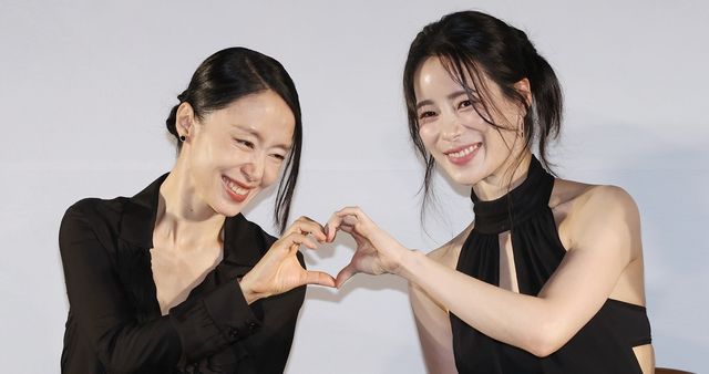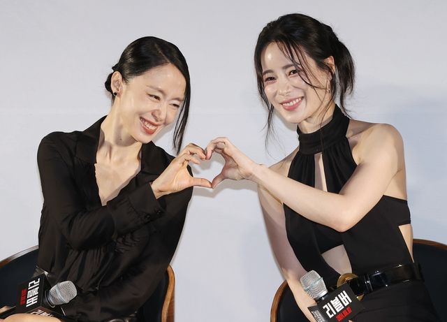 배우 전도연(왼쪽)과 임지연이 지난달 9일 오전 서울 강남구 메가박스 코엑스점에서 열린 영화 '리볼버' 제작보고회에서 포즈를 취하고 있다. / 연합뉴스