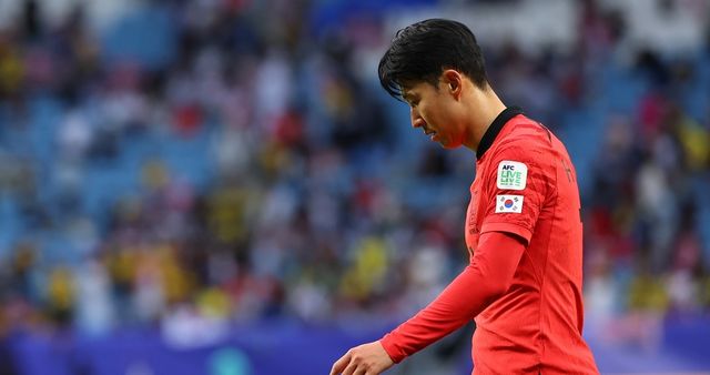 지난 1월 25일(현지 시각) 카타르 알와크라 알자누브 스타디움 열린 2023 아시아축구연맹(AFC) 아시안컵 조별리그 E조 최종전 한국과 말레이시아의 경기가 3대3으로 끝나자, 대표팀 주장 손흥민이 고개를 숙이고 있다. / 연합뉴스