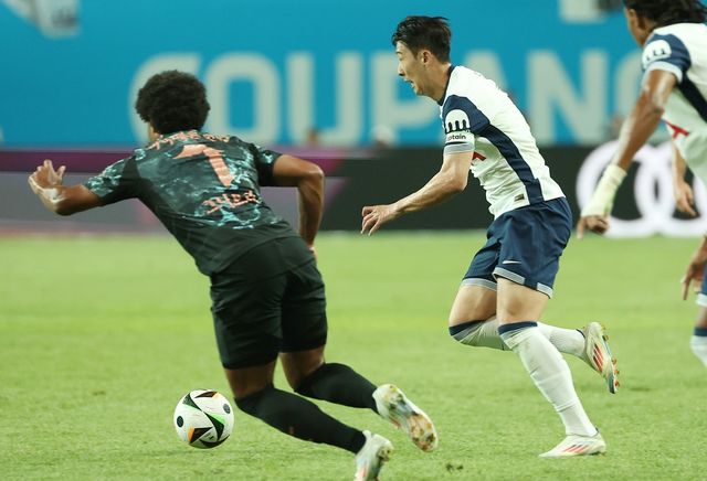 지난 3일 서울월드컵경기장에서 열린 2024 쿠팡플레이 시리즈 2차전 토트넘과 바이에른 뮌헨의 경기에서 토트넘 손흥민이 드리블하고 있다. / 연합뉴스