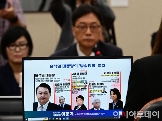 아시아투데이 이병화 기자 = 9일 국회 과학기술정보방송통신위원회에서 열린 불법적 방송문화진흥회(방문진) 이사 선임 등 방송장악 관련 1차 청문회에서 이훈기 더불어민주당 의원의 윤석열 대통령과 역대 방송통신위원장 관련 PPT가 화면에 나오고 있다.