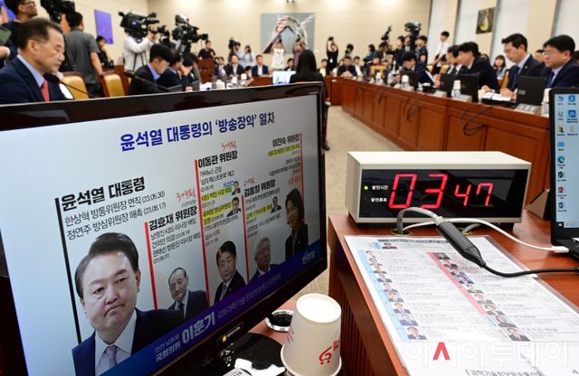 아시아투데이 이병화 기자 = 9일 국회 과학기술정보방송통신위원회에서 열린 불법적 방송문화진흥회(방문진) 이사 선임 등 방송장악 관련 1차 청문회에서 이훈기 더불어민주당 의원의 윤석열 대통령과 역대 방송통신위원장 관련 PPT가 화면에 나오고 있다.