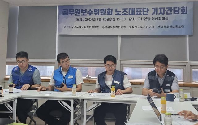 공무원보수위원회(공보위) 노조대표단이 지난달 25일 서울 여의도 한국노총회관에서 공보위 결정에 관한 기자간담회를 개최하고 있다. 연합뉴스