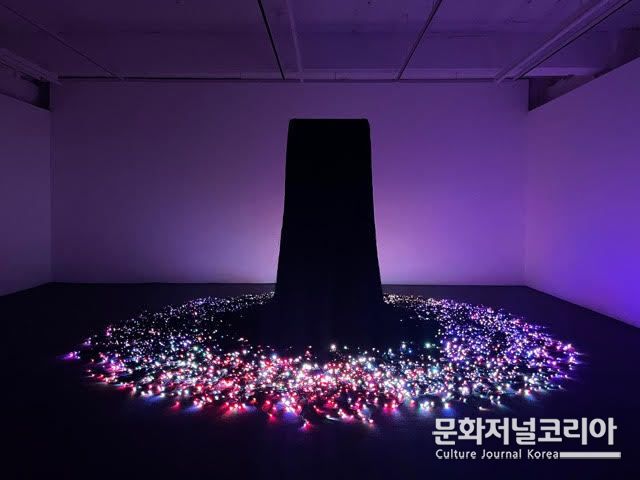 〈움브라 (Umbra)〉(2024)는 사각의 직립 구조물 형태의 LED 디스플레이 모듈과 거기서 정교하게 분해된 픽셀들이 커다란 빛의 서클을 이루며 바닥에 흩뿌려진 작업이다. 원본 영상의 이미지를 추정할 수 없게끔 뒤섞이고 흐트러진 각각의 램프는 소리에 의존하여 어떠한 패턴이 있음을 암시한 채 아름다운 빛의 흐름을 만들어 낸다. 시간성과 서사성이 해체된 영상에서 이미지를 이루지 못하고 그저 빛의 깜빡임으로 환원된 각각의 픽셀들은 물질의 가장 기본 단위인 원자를 떠올리게 한다. 인간의 삶의 근간을 이루는 시간성과 서사성의 실재에 대한 작가의 탐구에서 출발한 픽셀 작업은, 〈A Scattering Time〉(2019)과 〈Blue Hour〉(2023)를 거치며 〈움브라〉에 이르러 삶이라는 환영의 실체를 보다 입체적이고 몰입적으로 표현한다.