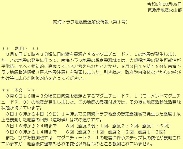 8월 9일 난카이 트로프 지진 관련 해설 정보 일부 발췌/일본 기상청 지진 화산부(포인트경제)