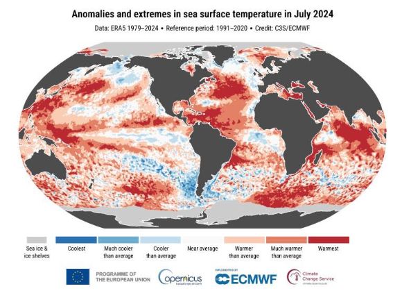 2024년 7월은 전 세계적으로 두 번째로 더운 달로 기록됐다. 유럽연합(EU)의 코페르니쿠스 기후변화 서비스(C3S)의 관련 데이터(ERA5)를 분석한 결과 올해 7월은 2023년 7월과 비교했을 때 0.04°C 낮았다.